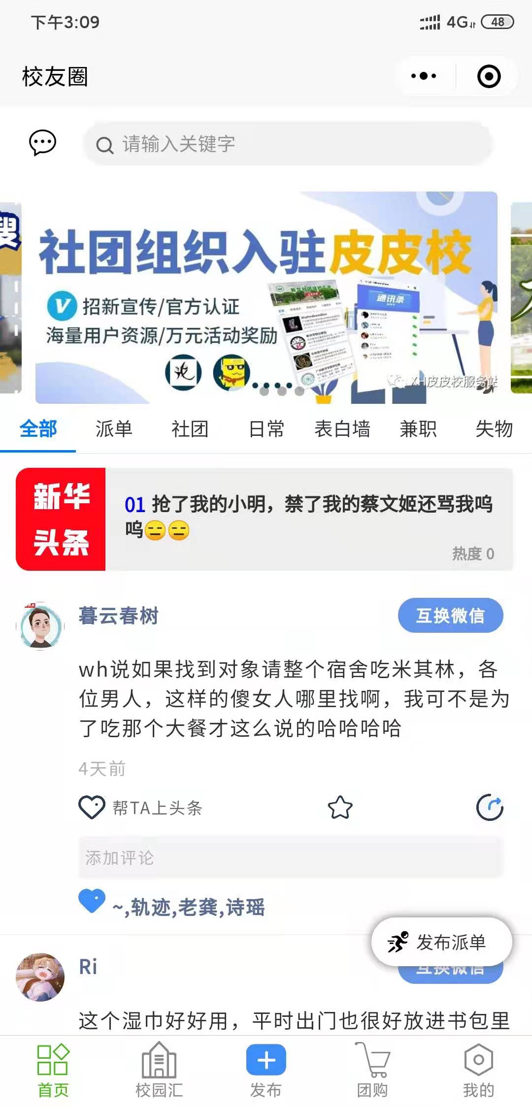 皮皮校是解决校园内需求的一个小程序、功能有表白墙、团购商城、论坛。可以进行派单让其他同学帮自己做事情,可以看附近特价餐厅、可以团购特价商品、组织团建等等。